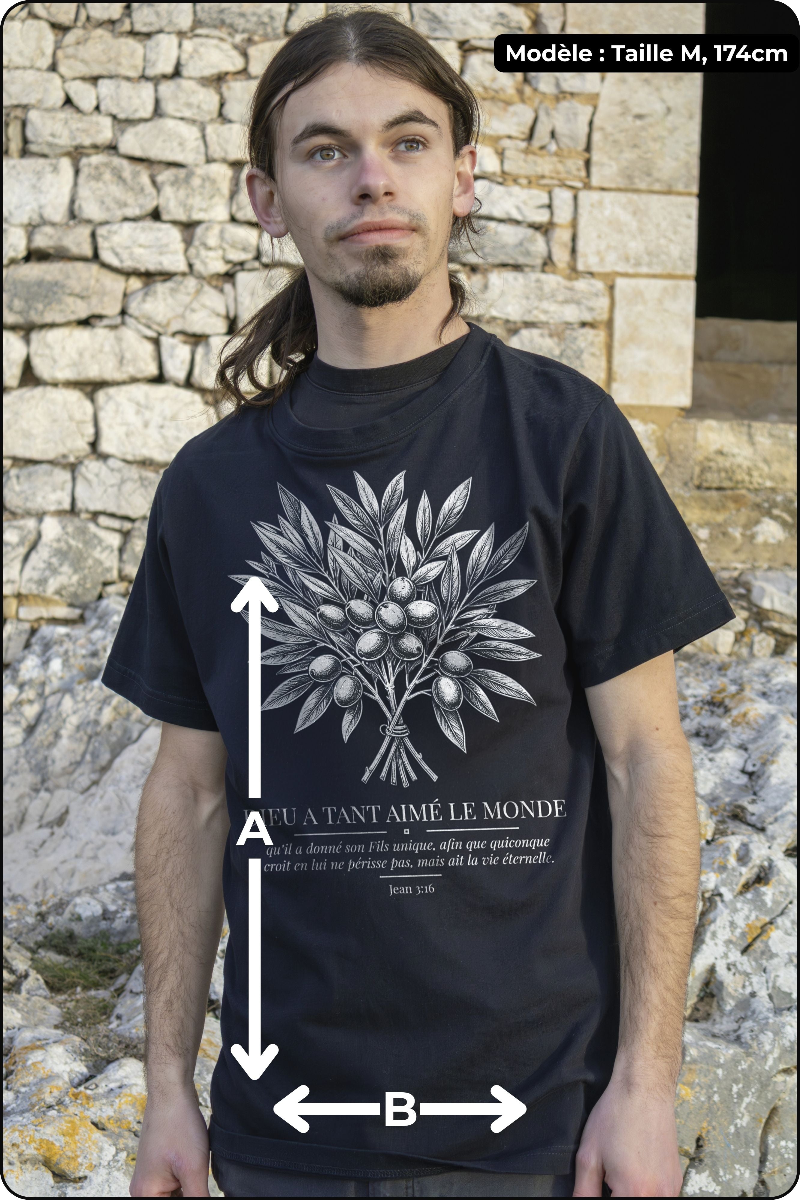 Nos t-shirts taillent amples : en cas d’hésitation, prenez une taille en dessous (L → M).
